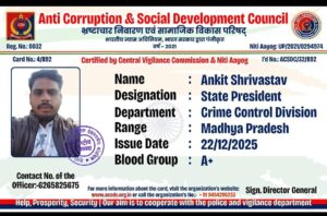 अंकित श्रीवास्तव को भ्रष्टाचार निवारण एवं सामाजिक विकास परिषद ( Anti Corruption & Social DeveLeopment Council ) के प्रदेश अध्यक्ष की महत्वपूर्ण जिम्मेदारी ने शहर का नाम रोशन किया है ।